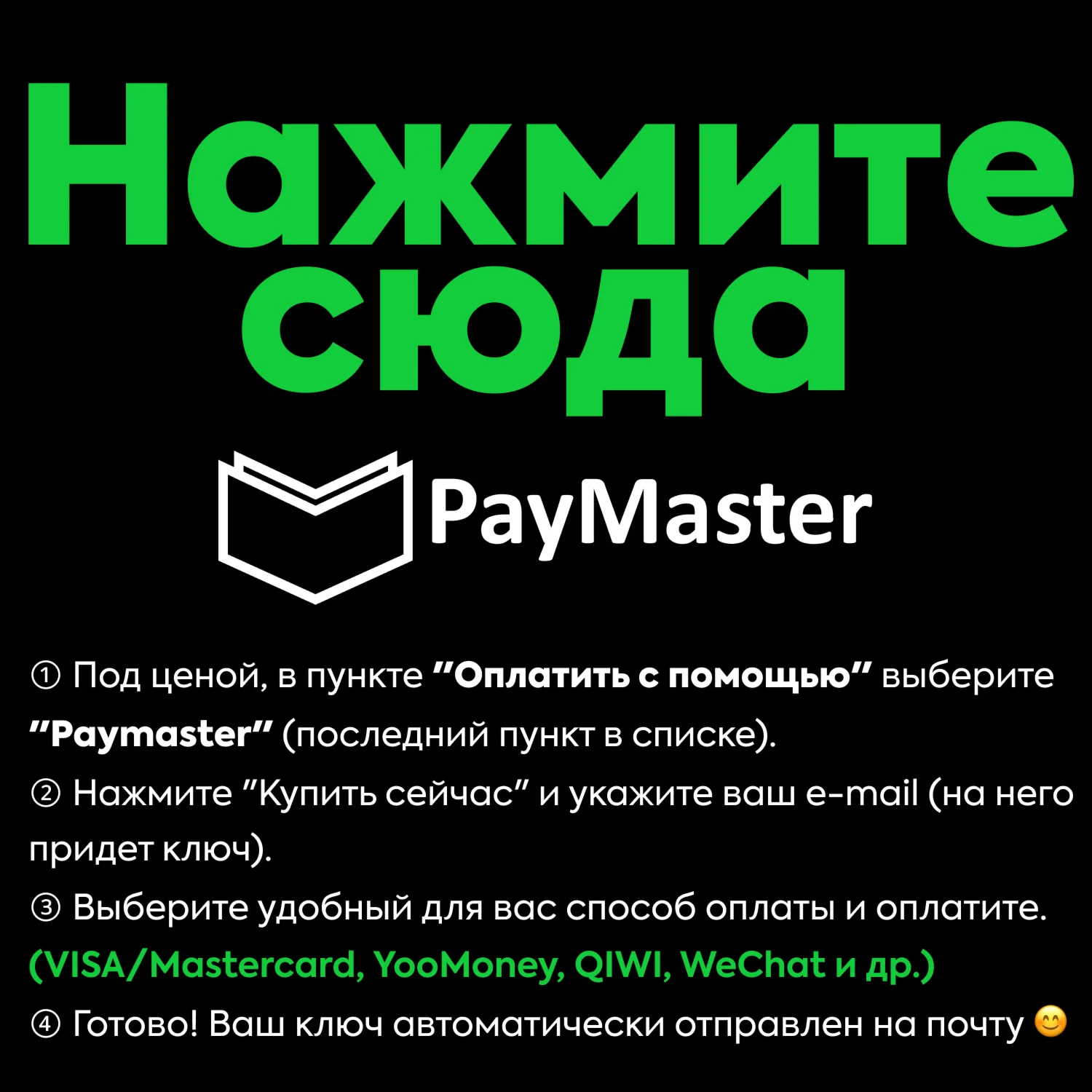 ③ Выберите удобный для вас способ оплаты и оплатите (VISA/Mastercard, YooMoney, QIWI, WeChat, др.).