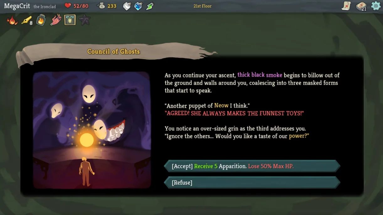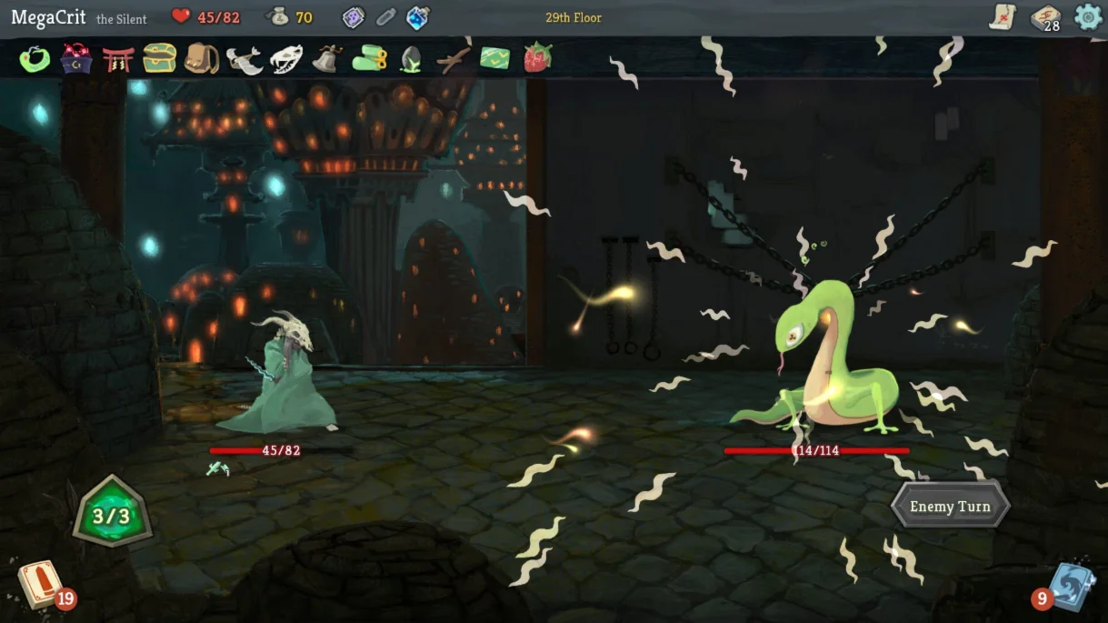 - Постоянно меняющийся шпиль: всякий раз, когда вы отправляетесь в путешествие по Шпилю, планировка каждый раз меняется. Выбирайте рискованный или безопасный путь, сталкивайтесь с разными врагами, выбирайте разные карты, находите разные реликвии и даже сражайтесь с разными боссами!